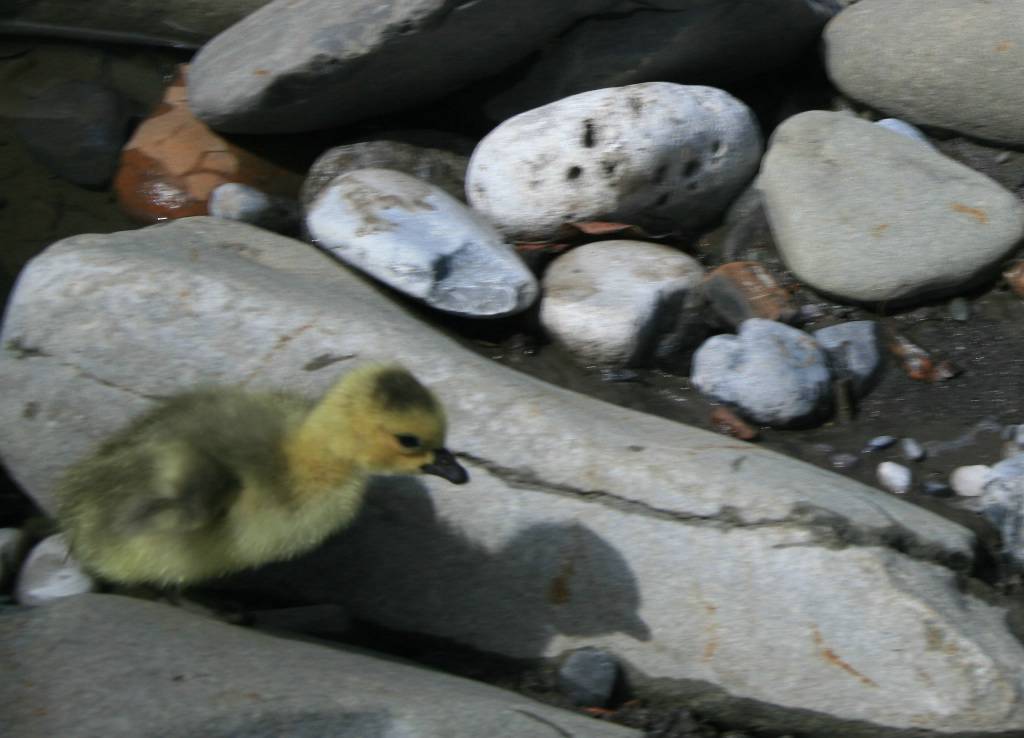Frightened gosling at river edge