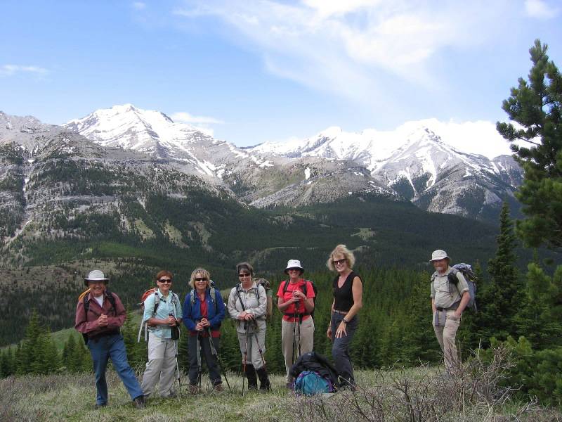 Laszlo, Kathy, Barbara, Aldis, Pat, Carolyn & Bill. Holy Cross Mtn on left, Mt Head to right.