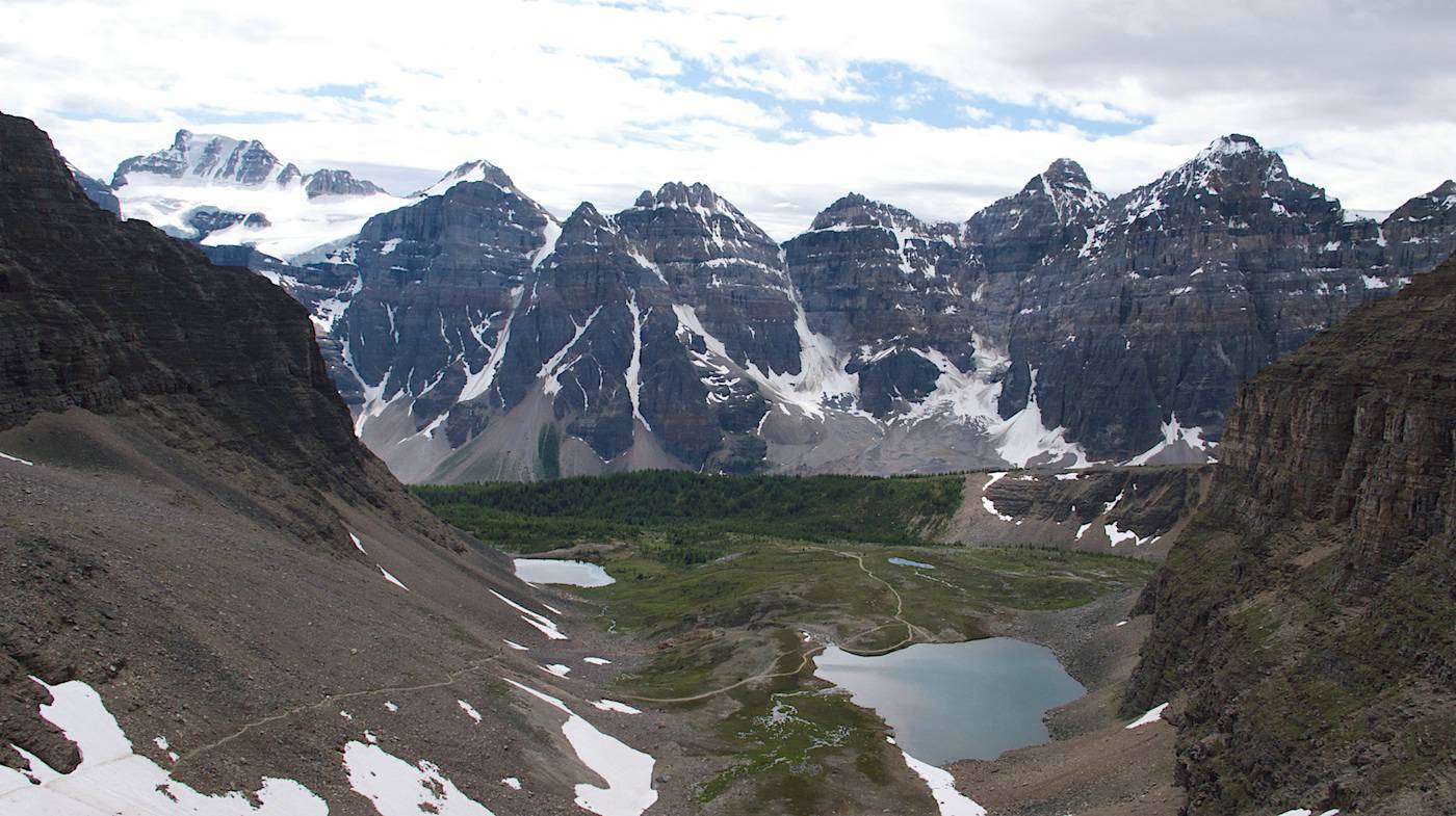 Looking from Sentinel Pass across Larch Valley and across the Valley of The TEn Peaks