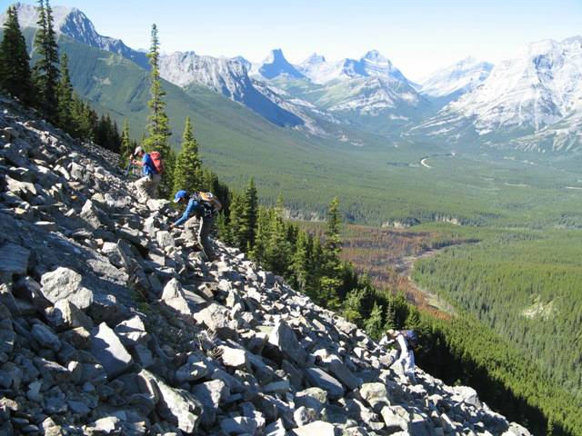 scrambling up boulder slope to Volcano peak