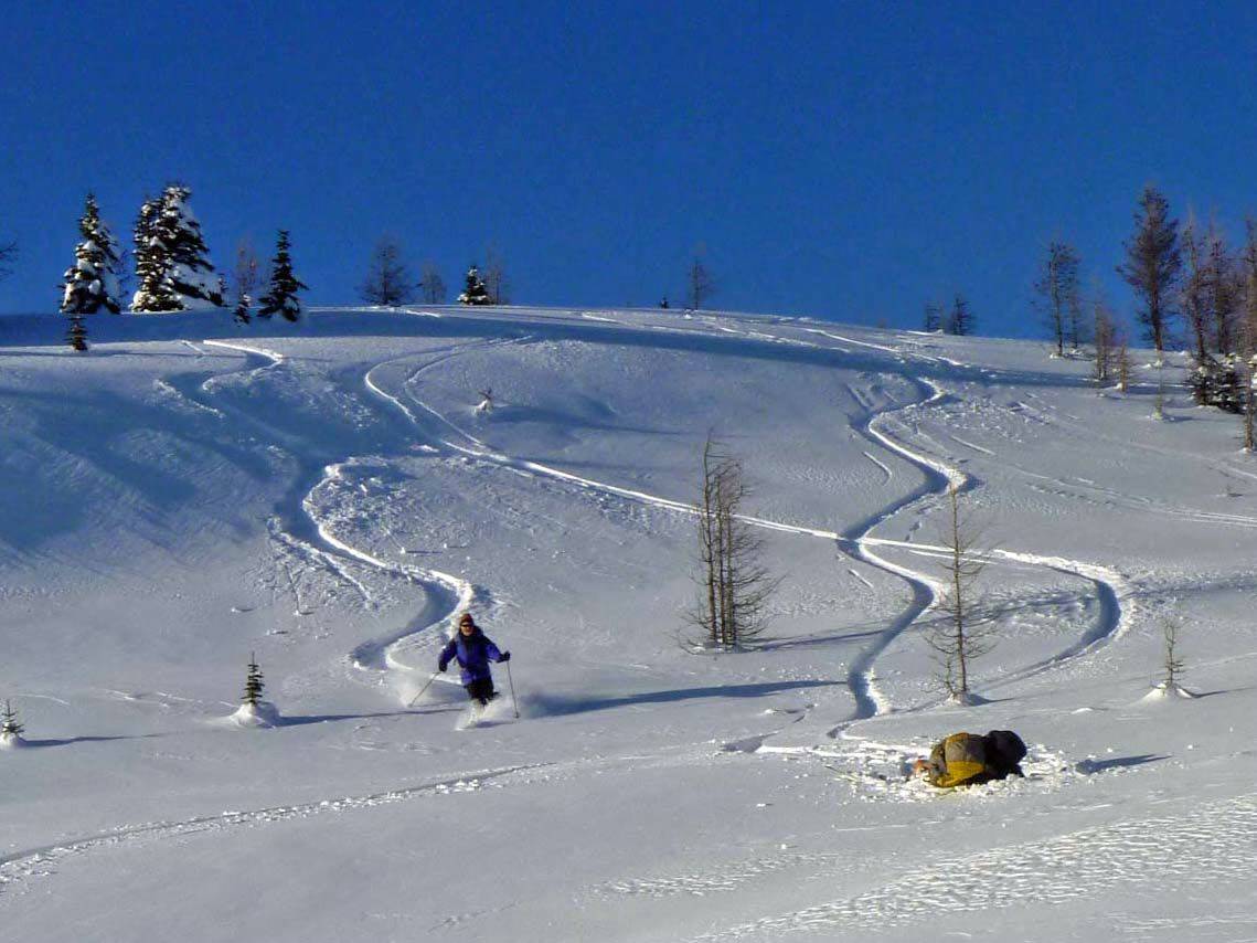 Bill making nice turns, unidentified skier checking out snow crystal structure