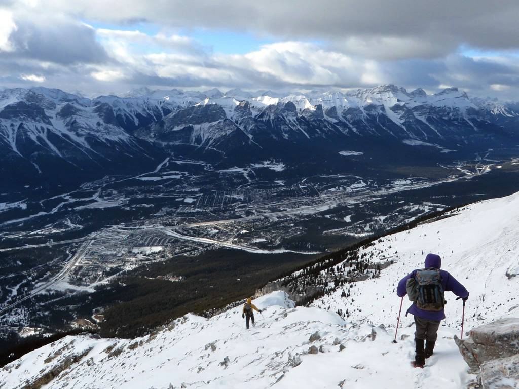 Heading back down the ridge with Canmore below