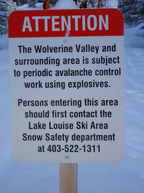 Warning sign near trail entrance to Wolverine Valley. You can also phone the toll free Lake Louise information # 1-877-956-8473.