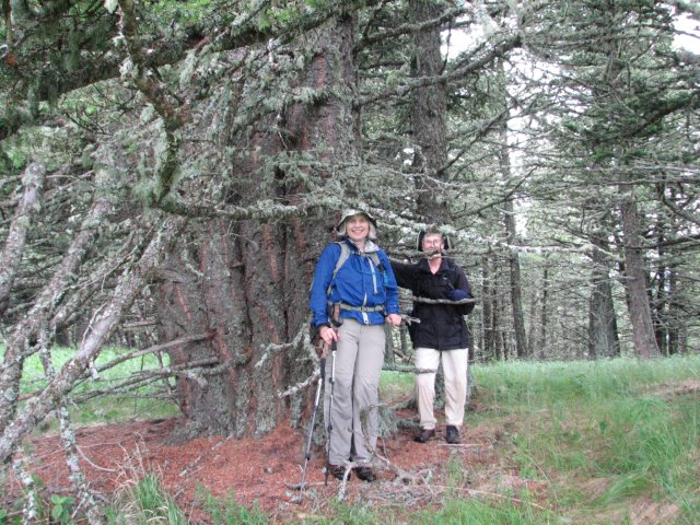 Jane and Mary with four-trunk Douglas fir cluster on Black Mountain