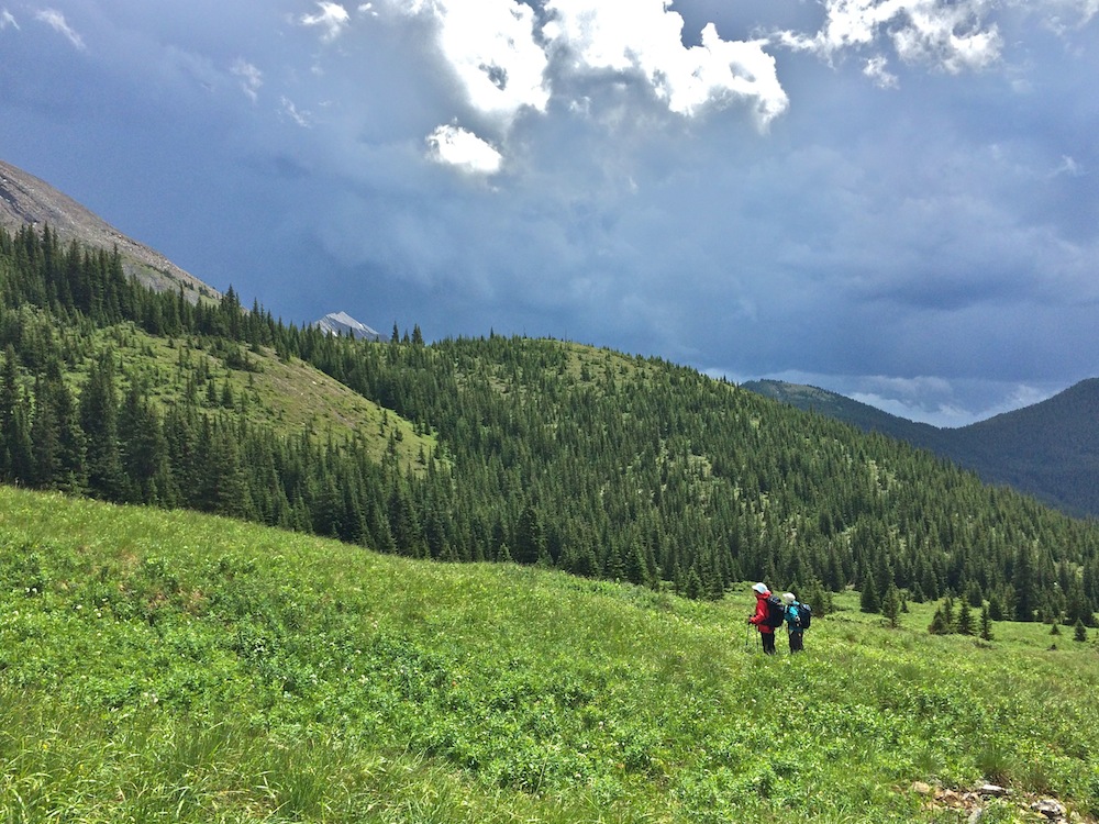 Sue and Carmie looking at some of the storm clouds behind Lineham Peak