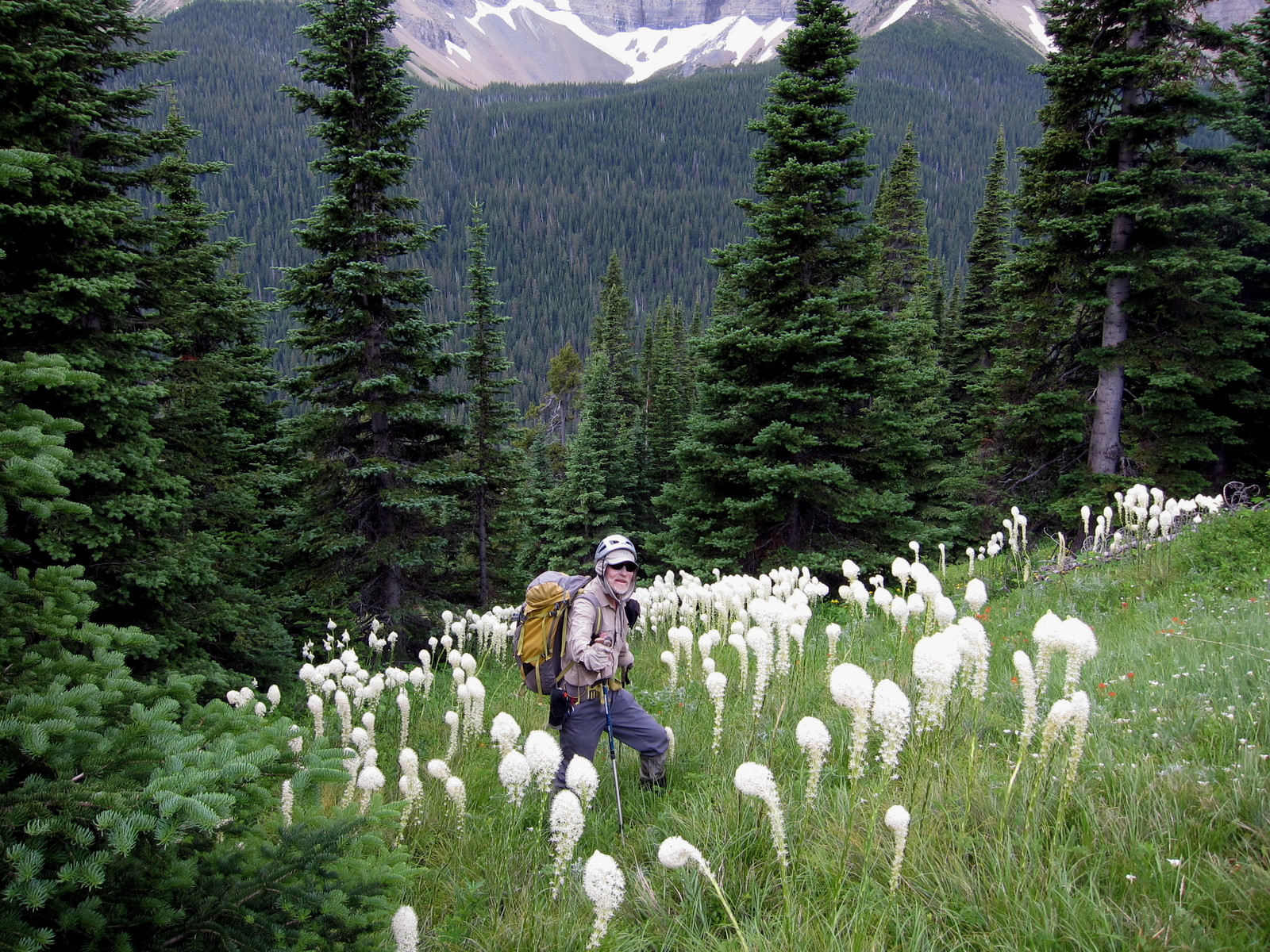 Arnold in bear grass in one of the patchy meadows descending Mount Glendowan