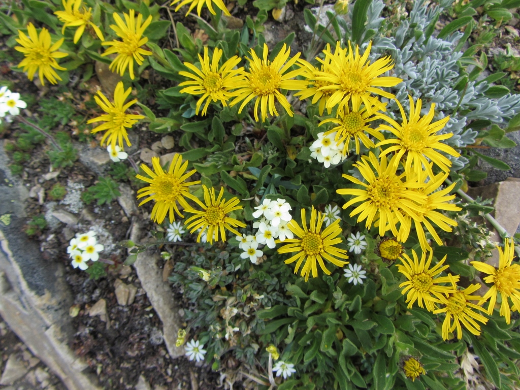 Lyall's Iron Plant (Haplopappus lyalli) mixed with rock jasmine (Androsace chamaejasme) and Alpine starwort (Stellaria monantha)