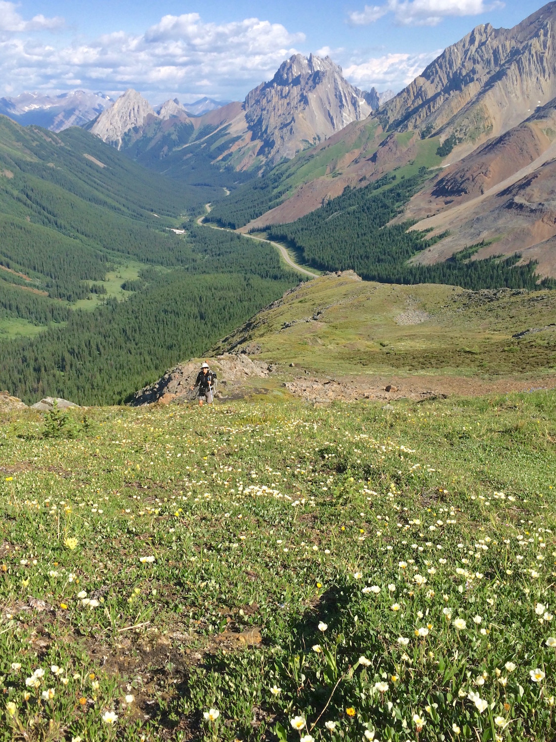 Looking back along the lower part of Highwood Ridge with Katrin catching up after taking photos of some of the lush flower displays.