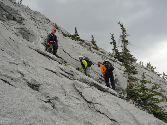 Steep slabs on Ridge of Mt. Princess Margaret: Damian, Alda, Jack