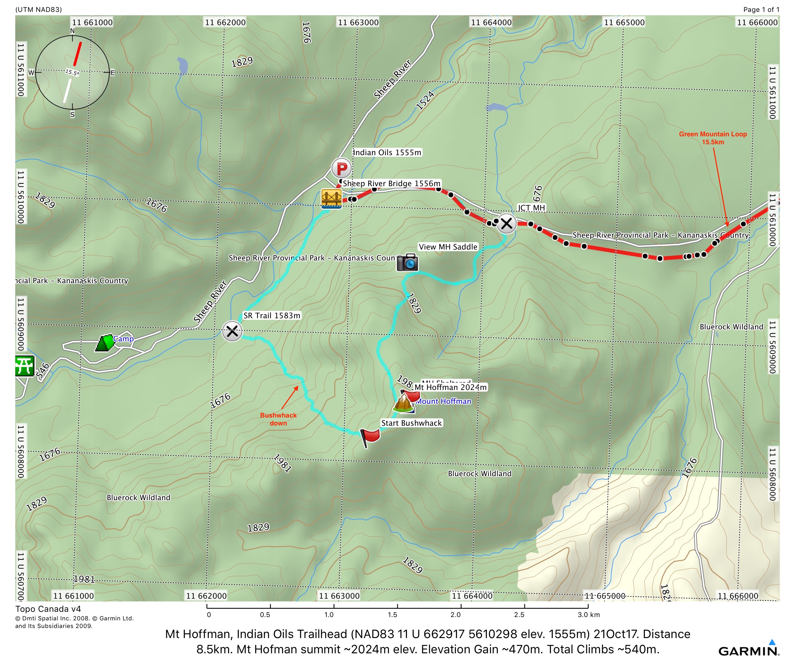 Mount Hoffman Hike - Follow trails up - Easy bushwhack down to Sheep River - 8.5km Elevation Gain ~470m - Total climbs ~540m. 21Oct17.