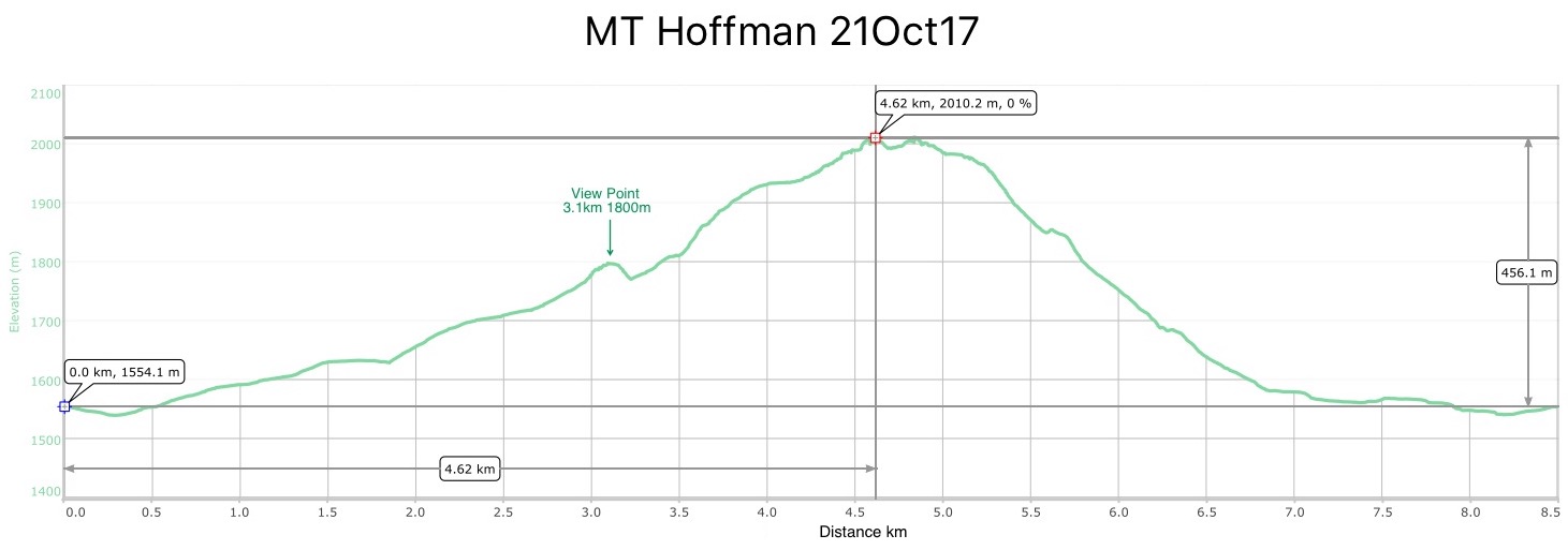 Mt Hoffman profile ~8.5km. Elevation Gain ~470m - Total Climbs ~540m. Easy Bushwhack down to Sheep River.