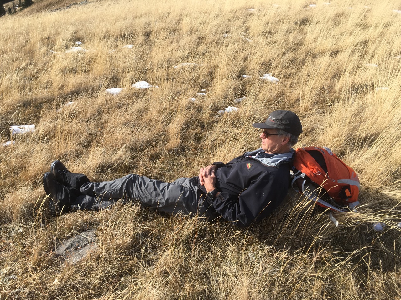 Evan enjoying the sun and view at Mist Ridge Col