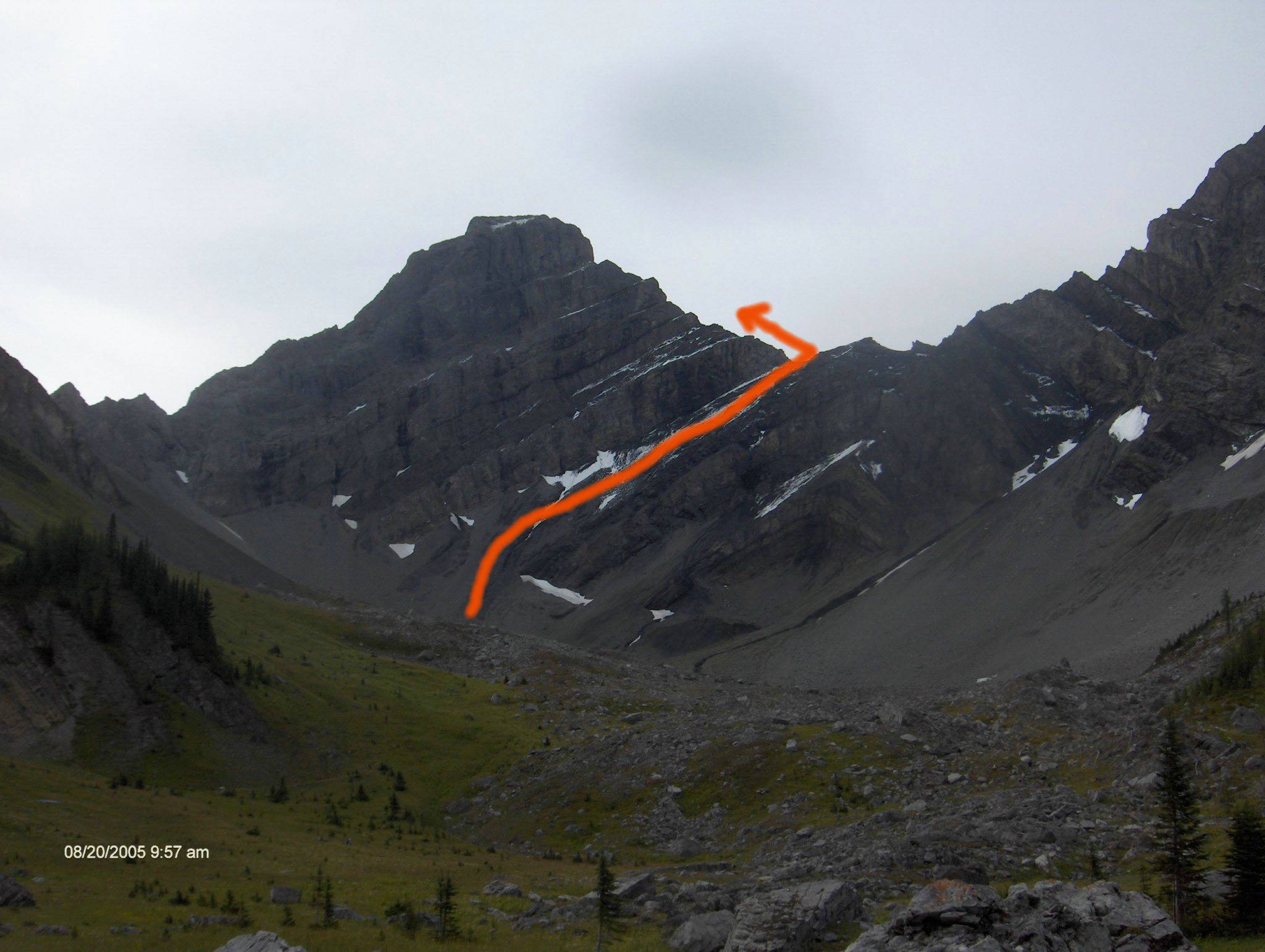 This scree ledge is quite steep and would be a hazard if frozen. Rock falls from rock band above ledge.