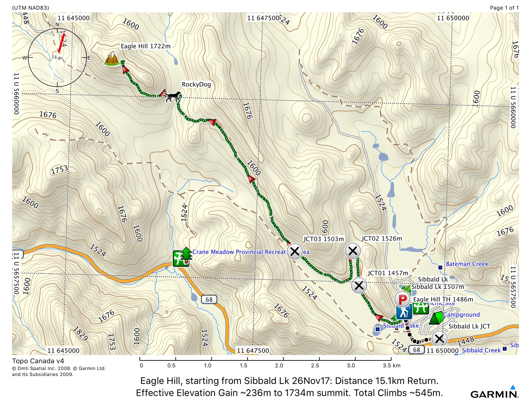 Eagle Hill Hike Track starting from Sibbald Lake. Distance ~15.1km Return. Effective elevation Gain ~236m to Summit at 1722m, or, 1734m depending on info source.