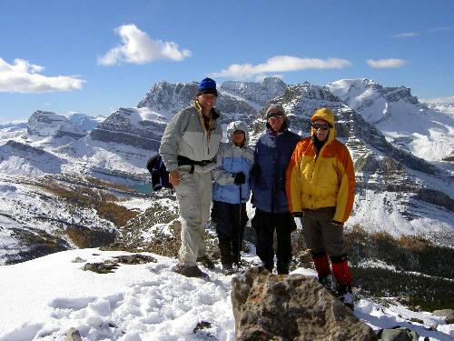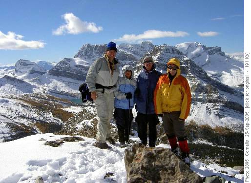 Cornelis, Dee, David and John on summit Skoki mountain after an overnight camp at Merlin meadows.