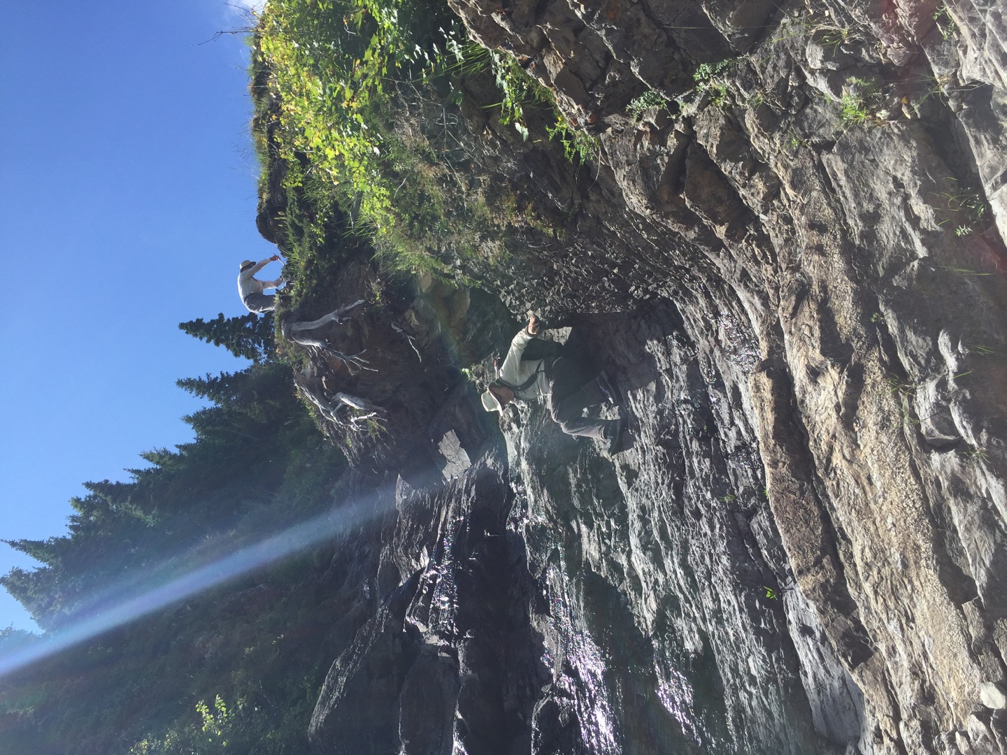 Scrambling down adjacent the waterfall