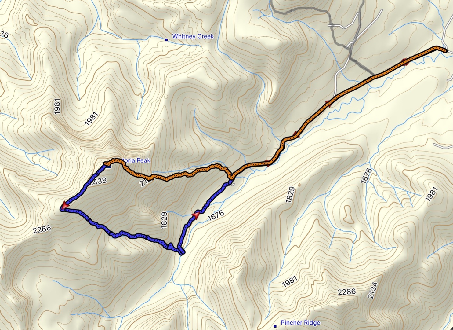 Our route up Victoria Peak (orange) and down the Gannon route (blue)