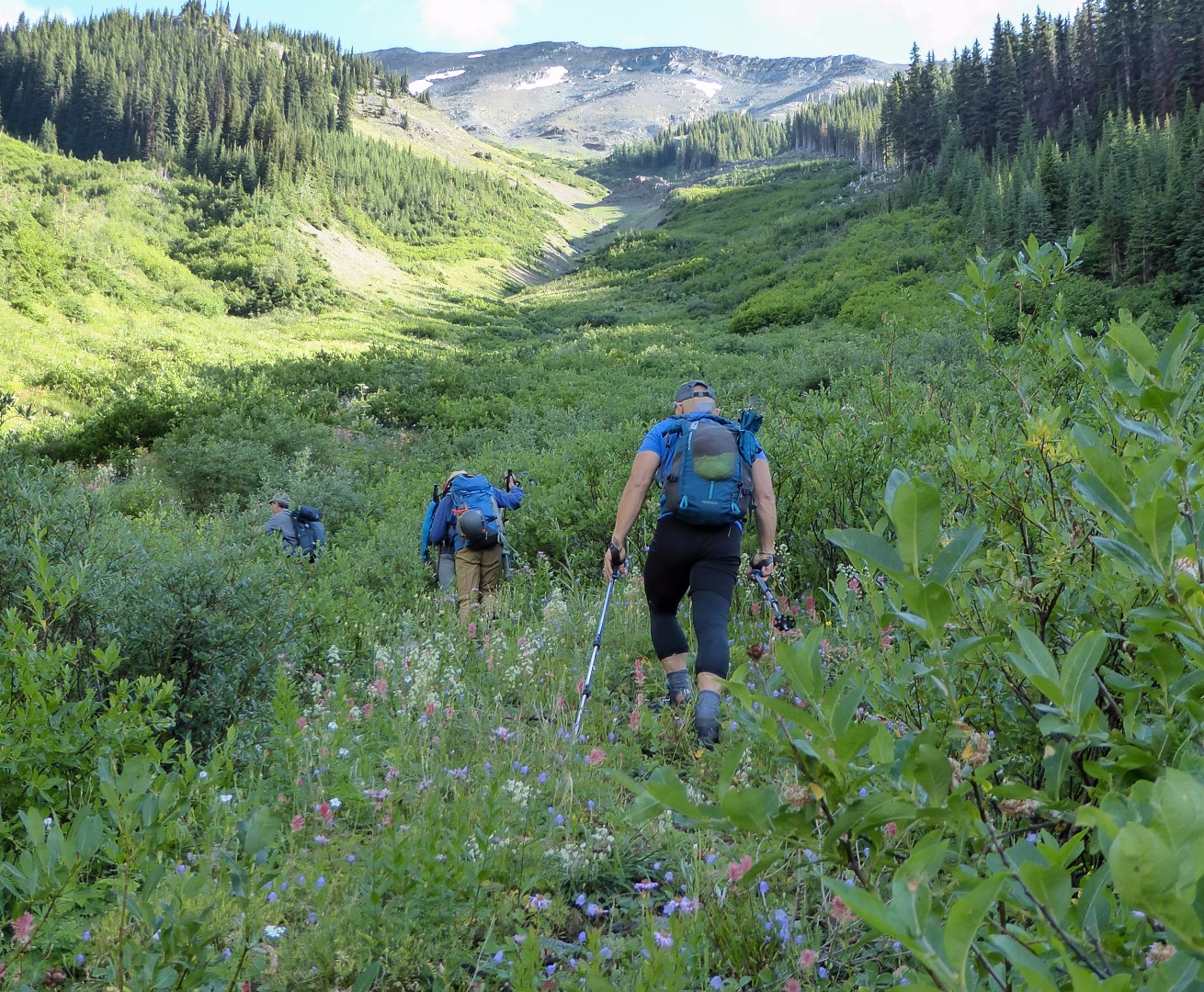 Ascending the avalanche gully, we veered right and slogged up the scree.