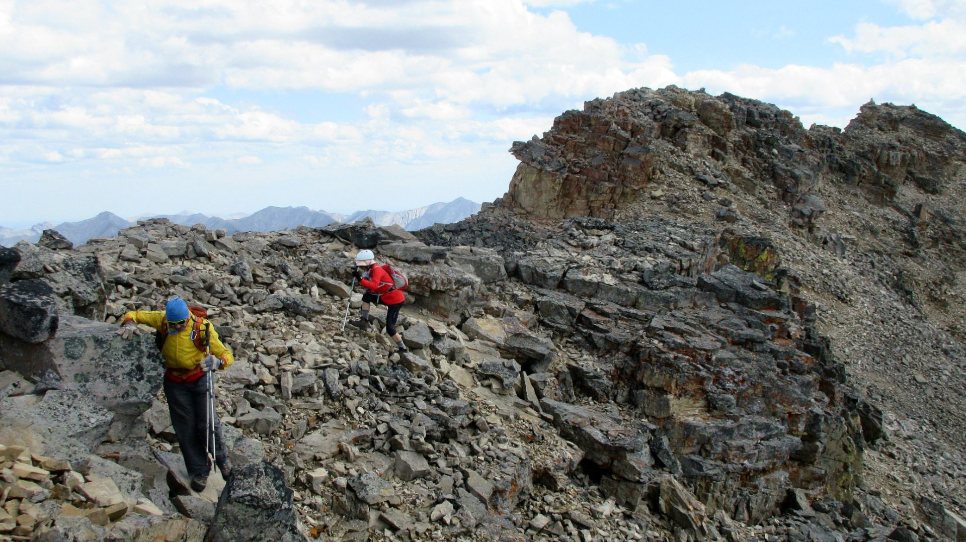 David and Toshiko descend the ridge of south Mt. Kidd (summit in the top right)