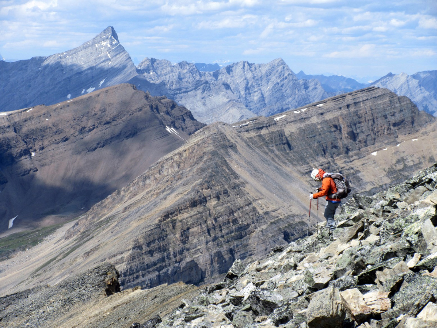 Sim descends the talus of south Mt. Kidd (Mt. Galatea in the top left)