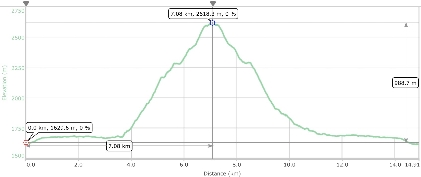 14.9 km, 989 m net elevation, 1,118 m cumulative, 8 hours