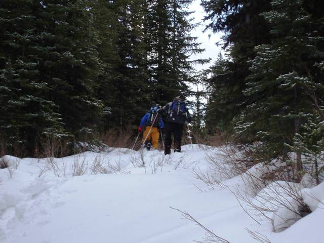 The Gypsum Mines route ascends through moderate forest and excellent early season snow.
