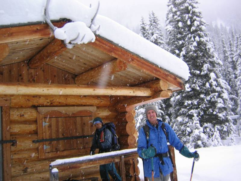Sim and David preparing to leave a sheltered lunch spot with snow coming down.
