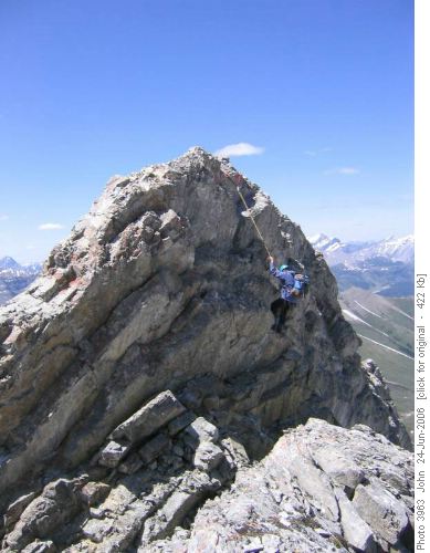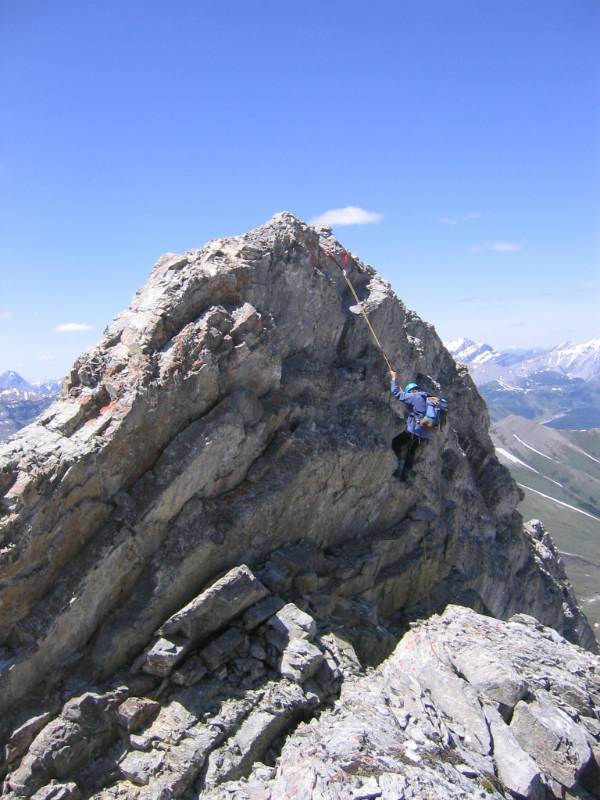 Ascending Evan-Thomas requires this down section along the ridge which then needs to be ascended on the descent. David is rappelling. Rope can be left for the return.