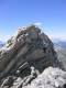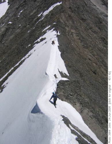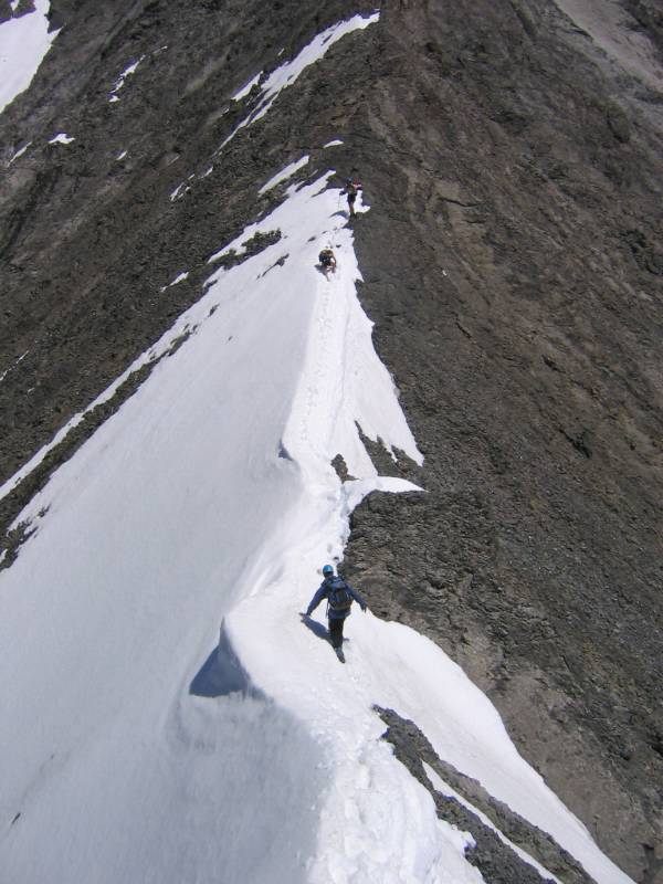 Susan and David crossing snow arete on ridge of Evan-Thomas.