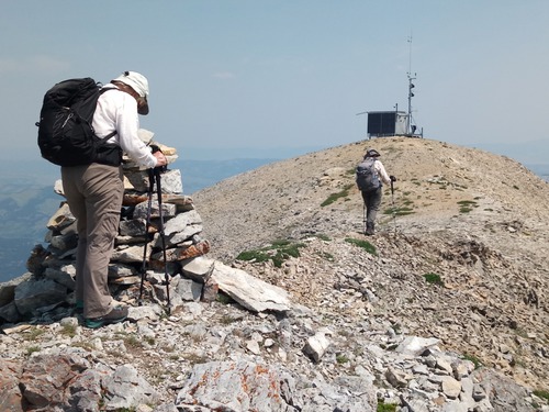 Summit cairn and a building with antennae