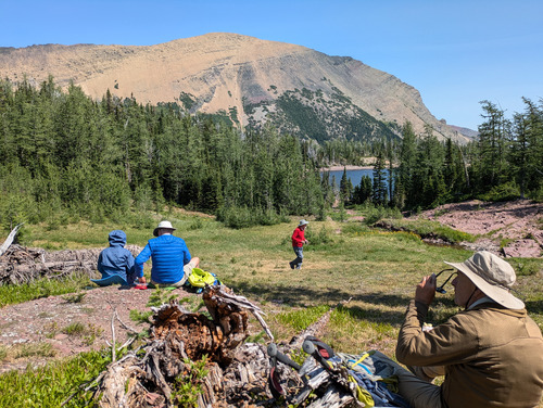 Lunch overlooking middle Rowe Lake, Lineham Peak in distance