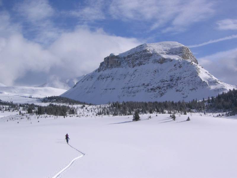 Stuart and guest Shawn break trail towards Citadel pass crossing Citadel lake. Citadel pass is to the left (east) of the peak.