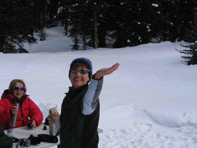 Kathy feeding whiskey jacks, Barbara in background