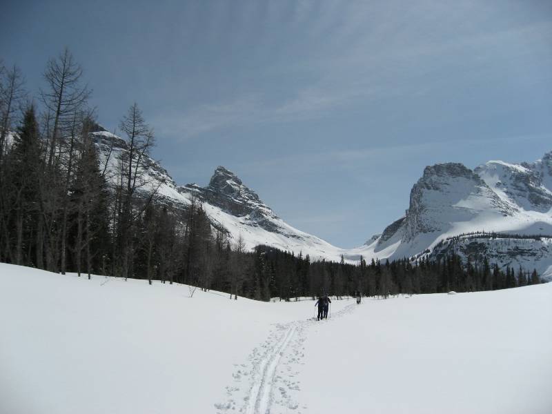 Kaare in front breaking trail through sticky wet snow in the heat. Pharoah peaks on left of photo.