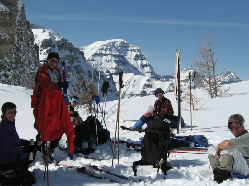 Joan, Bob,Sim, David and Kaare relaxing in beautiful warm, windless sunshine on Whistling pass.