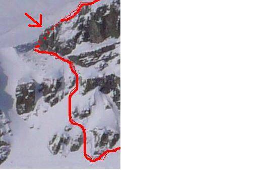 Zoomed detail of Ayesha route courtesy Jason Wilcox. Steepest section is on the north side and not visible in the photo. Indicated by the dotted line. This section was rapped by Jason's party on return from the summit.