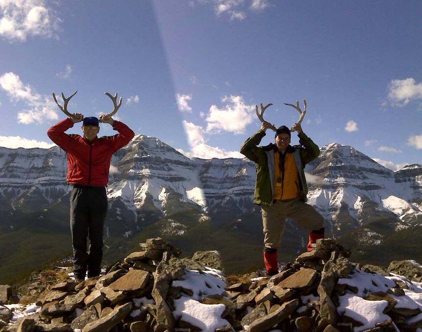 Joe and Cornelis sprouting horns on Mt Ware to deter the hunters