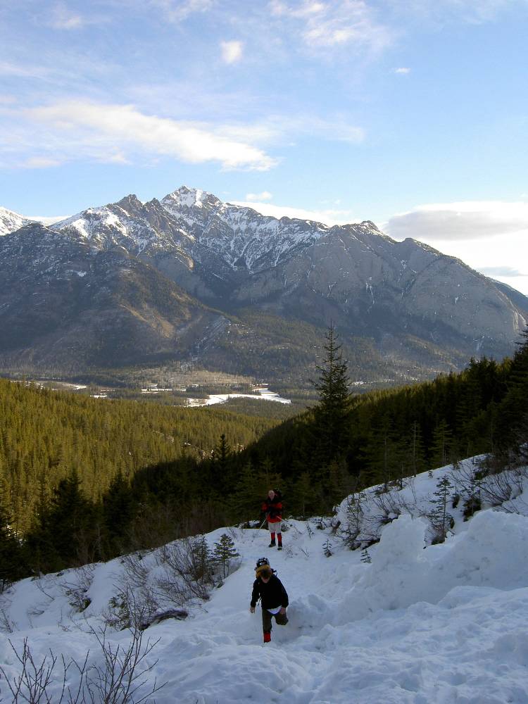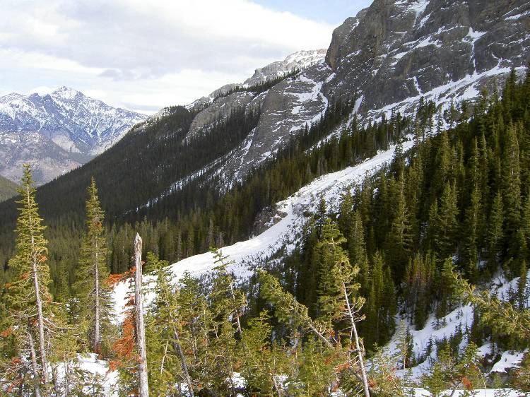 In all, I rate the Bourgeau Lake trail as Class 3 terrain, according to the National Park Rating. It should never be attempted after any kind of snowfall. In this case, the avalanche tracks were largely cleaned out and were stabilized during the preceding 4-week period of cyclic warming & freezing, without significant snowfall. In addition, avalanche conditions should be low, below, on and above the tree line. An advantage of the Bourgeau lake trail is that it mostly provides good views of the conditions overhead.