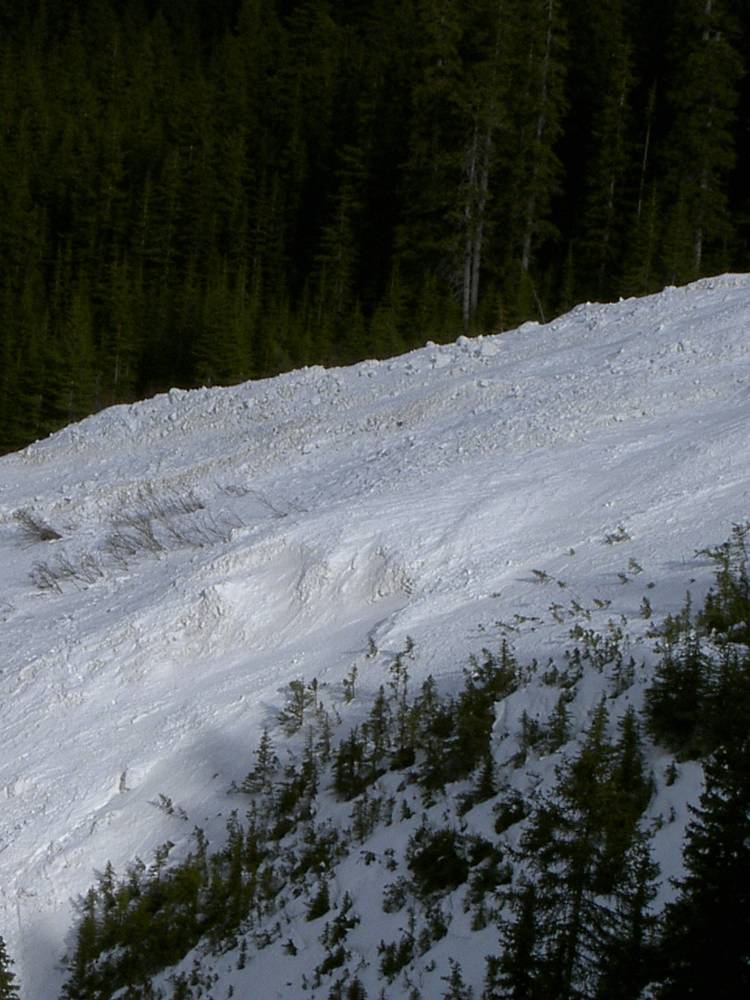 During the warm spell 4 weeks ago, avalanches (approximately Class 2), had cleared virtually all the snow off the avalanche tracks above the trail, also collapsing the cornices above. The resulting debris on the trail was frozen solid, like small glaciers with a little snow dusting on the surface. In all, we counted 7 avalanche debris deposits on the way up to where the trail crosses the creek flowing from Bourgeau Lake's basin. These large icy debris-bodies could linger until July. They could become unstable & dangerous during spring meltdown, something to keep in mind! Just before the trail crosses the creek below the waterfall from Bourgeau Lake's basin was the largest avalanche runout. The debris had consolidated into approximately 6m thick ice. It had originated in a small cirque South of the creek (above right top of the picture below), cleaned off the smooth 35' to 45' rock slope above a 15m high rock-ledge, then settled onto the less steep area below (see pictures).
