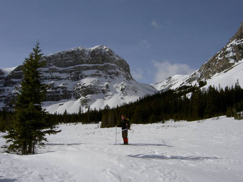 We did not proceed above the lake to Harvey Pass, since snow conditions in the pass above the lake looked very unstable, with what looked like a thin layer of facetted snow on steep scree slopes and smooth wind-slab formation. The wind blew plumes of dry snow across these scree slopes. The lake itself was in the shade (-4'C), cold & wind-blown. Therefore, we backtracked a little distance and had lunch comfortably in the sun (+2'C), with a beautiful view down to the Bow Valley and Mount Corry to the NE from 1:00 to 1:30PM. We made an easy, relatively quick descent.