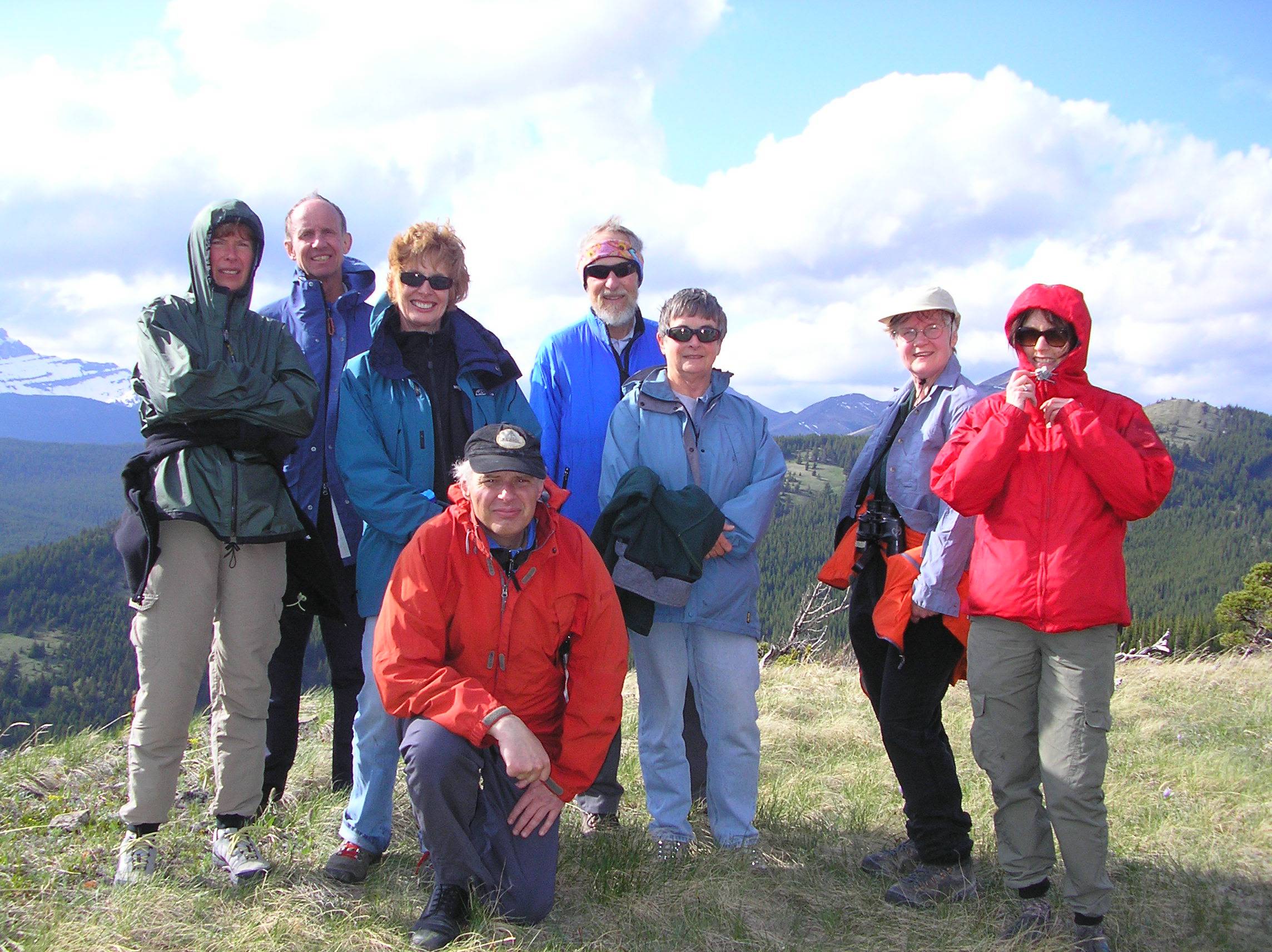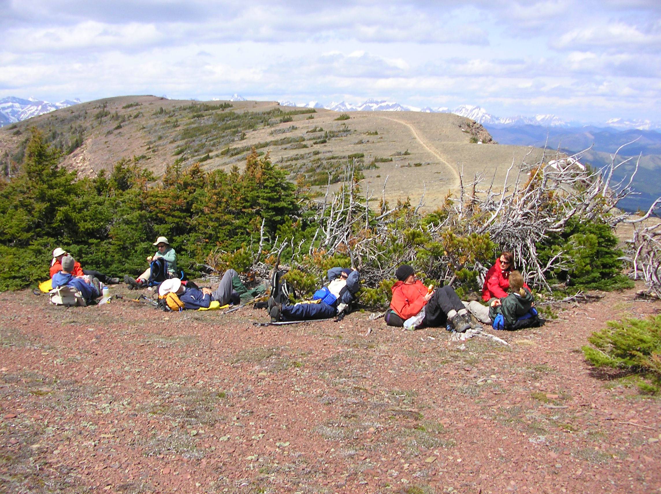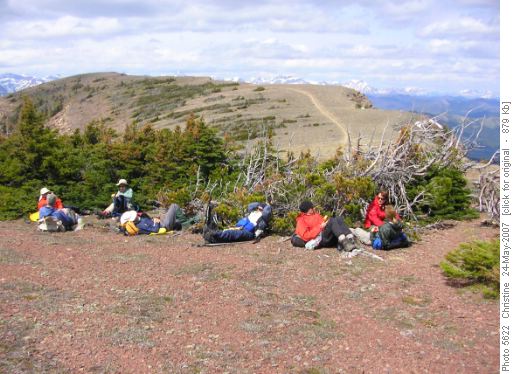 Sunday donned clear and sunny. Everyone was up and raring to go. Table Mountain would be the destination for the first part of the day. There is a great trail that begins at Beaver Mines Lake Campground and takes you up into a cirque below the summit ridge. The trail is less well defined from the cirque to the ridge but is much better than trying to directly crawl up loose scree to the ridge. The ridge was topped out with expansive views toward the prairies and looking down into Beaver Mines Lake. The face along Table Mtn. facing towards the prairies is near vertical for a fair distance down and quite spectacular. We wandered along the ridge to a sheltered grove of low trees and had lunch.