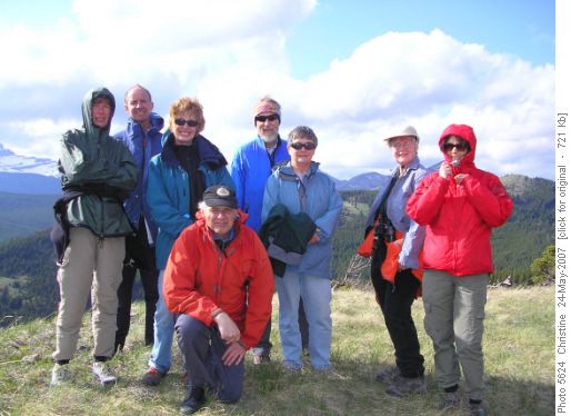 Alas, a bridge which we needed to cross the creek was washed out so the hike changed to partway up "Sasky" as the locals call it or Saskatoon Mountain as you would find it on the topo map. There are numerous trails on this mini-mountain and we were able to find our way up to the outcrop without too much difficulty. Since everyone was keen to stay out in the improving weather and wonderful views, we continued on for another 2-3km and summitted this 5900' behemoth.