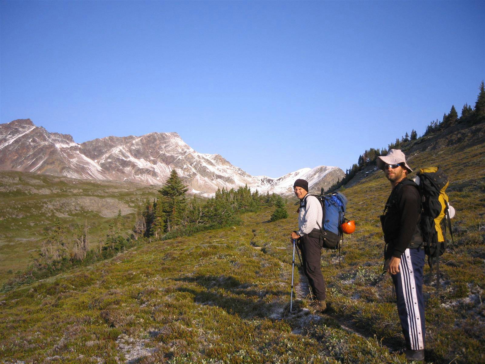 Bedtime was 8:00pm after standing around a fire that the guys had made to dry their socks and boots. Rise time was proposed at 6:00am. However, it was still dark at that time and the weather could not be determined. At 6:30am we were up to a very cool morning but clear sky. Off by 8:00am, we hiked up through the swamp section to Maligne Pass and a little beyond.