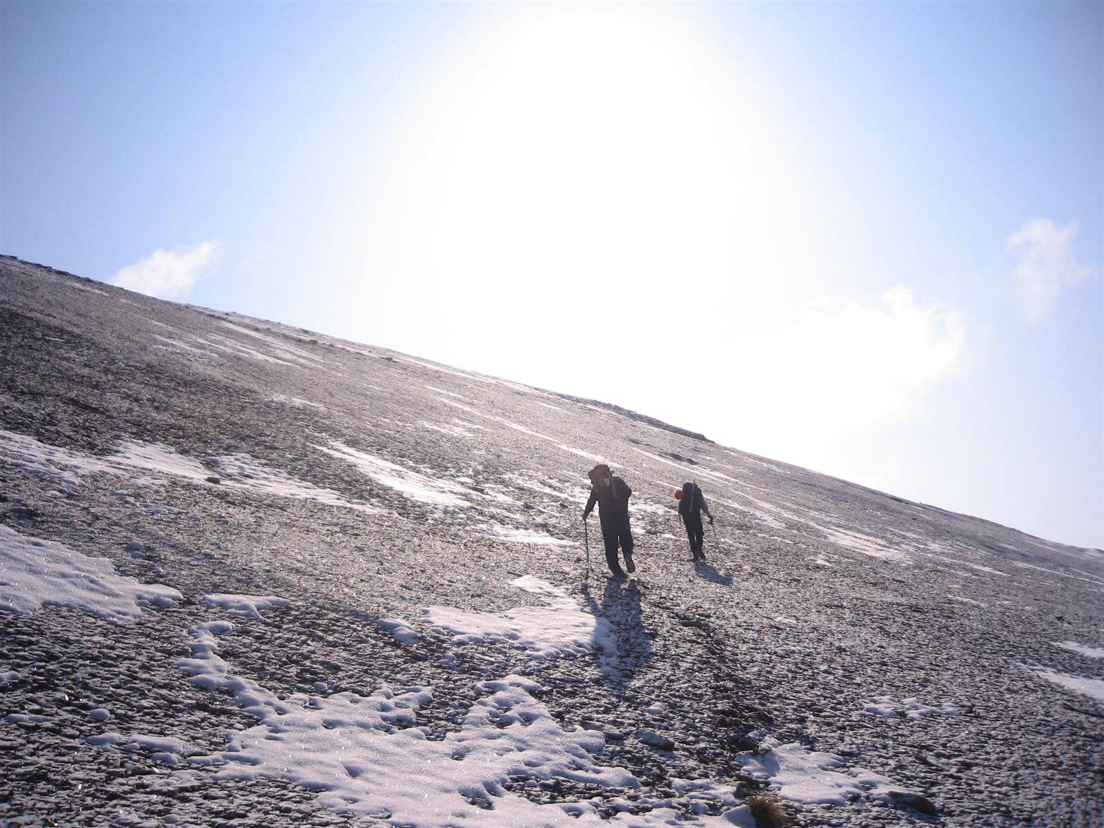 Here there was a steep slope up to the main ridge. Without snow it probably would be a scramble 5. However, there was just enough snow to make it slippery in spots. --invalid photo8950--