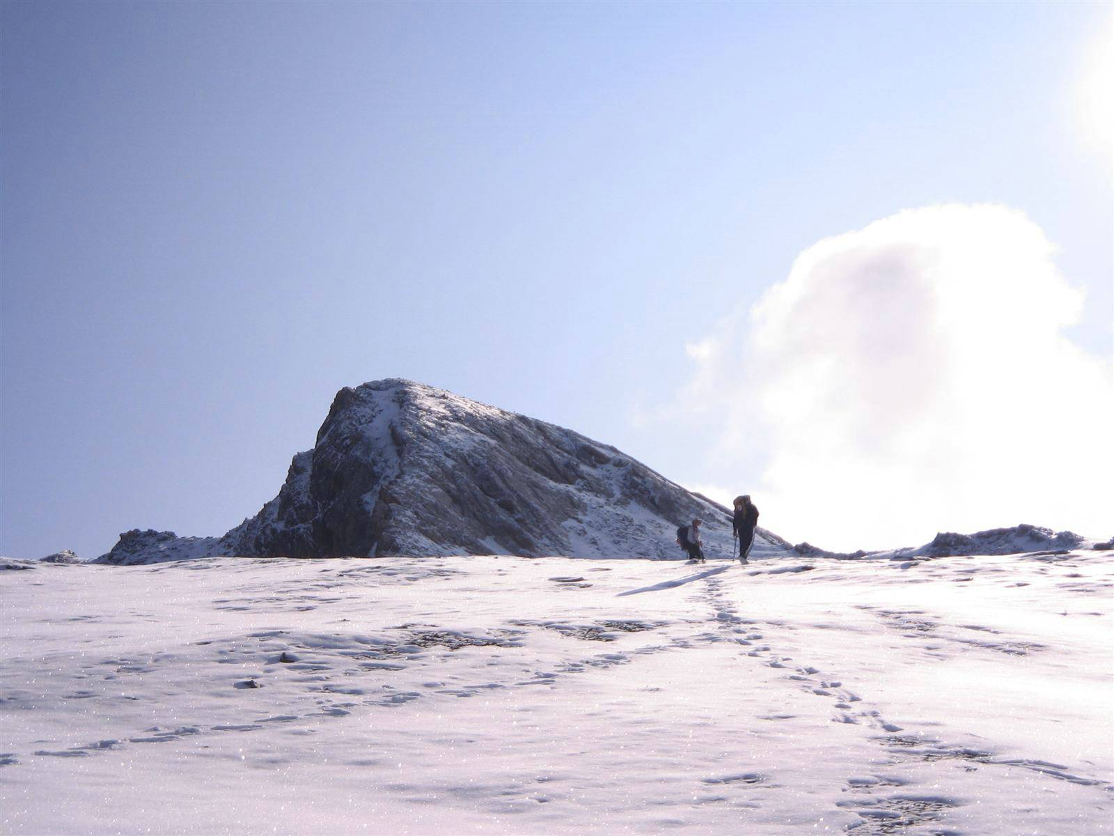 About 8,000 feet we hit new snow. Higher up there was new snow on top of hard old snow. However the slope was not steep and poles worked fine for extra traction. We followed the ridge around to the point where it joins the main north/south ridge.