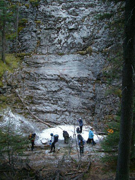 Beyond the chockstone the canyon slowly widened out to a valley with a large amount of rockfall which had peeled off the west side of Mount McGillivray probably in the last few hundred years. We climbed up and over this pile and eventually stopped for a first lunch around noon. After lunch we proceeded up the valley over a low ridge extending into the creek causing a big bend in the valley. Beyond the bend we were able to walk through forest in many places as it was reasonably open. We reached the gulley which will take one up to the summit of McGillivray and dropped back into the creek. From here the creek starts to narrow with heavy bush on each side. Further up there is a branch which takes off to the left and the creek further narrows with alder branches causing some difficulty in places for a while. Eventually the ridge on the right hand side drops much lower and it is at this point that one must climb out of the creek bed. We eventually encountered a fairly decent trail which we followed up to Skogan Pass where there was a hunter's camp. We seemed to lose the trail going down the back side and so stopped for a second lunch about 10 minutes beyond the hunter's camp. After lunch, we came across the main trail from the pass and followed it out to the Skogan Pass powerline service road. From here it was an easy hike back to the cars passing another hunter's camp on the way down. We were back at the cars around 3:00-3:15 and back into town around 4:30pm.