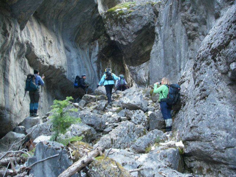 So when I called this trip, I figured we would go in the way we went in before. This worked fine and we dropped into the canyon beyond that course. However, what I had forgotten from the trip before was the little occasional pools with the short smooth waterfalls further up the canyon. Fortunately, these have now been made easier with ropes, chains and logs to get up them. When we started from the parking lot near McGillivray Creek there was already a car there. As we dropped down into the canyon,