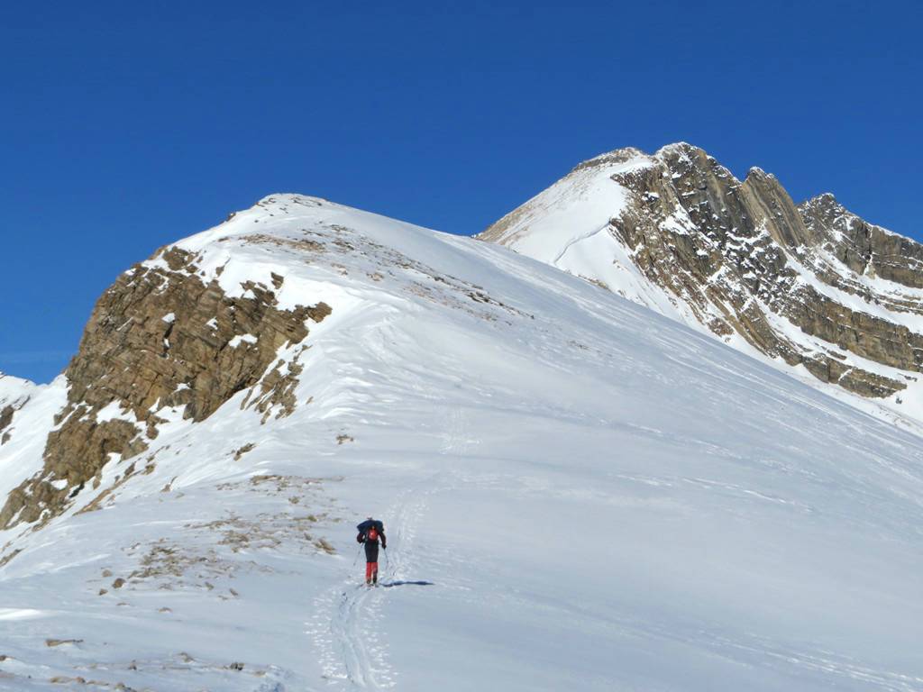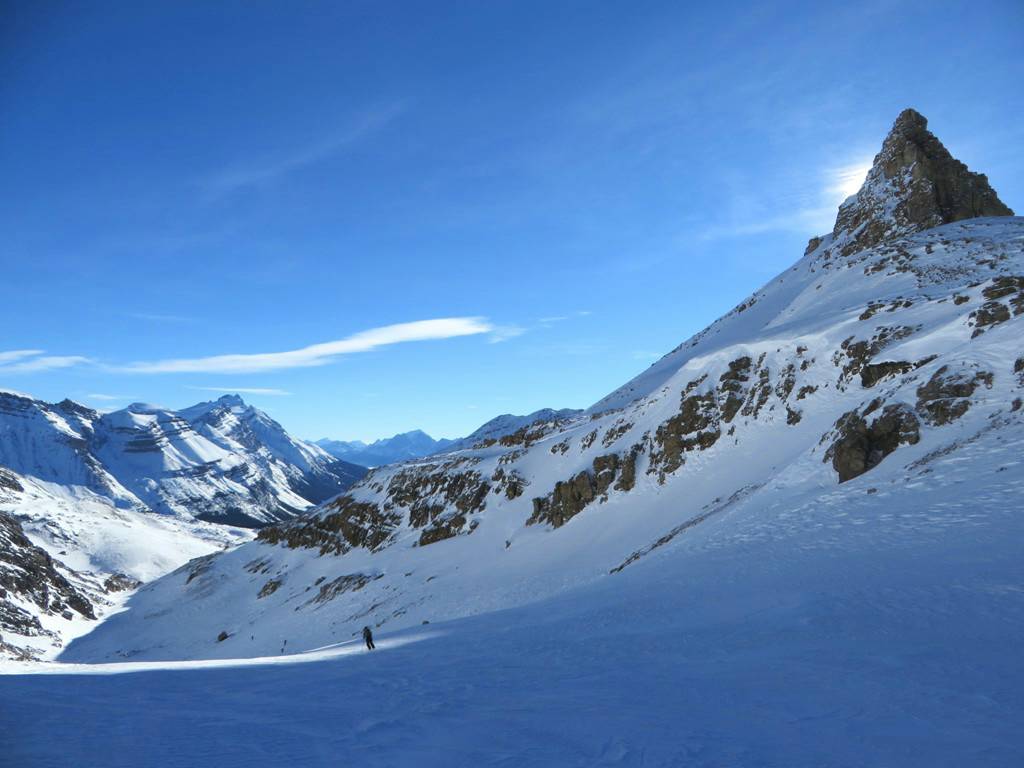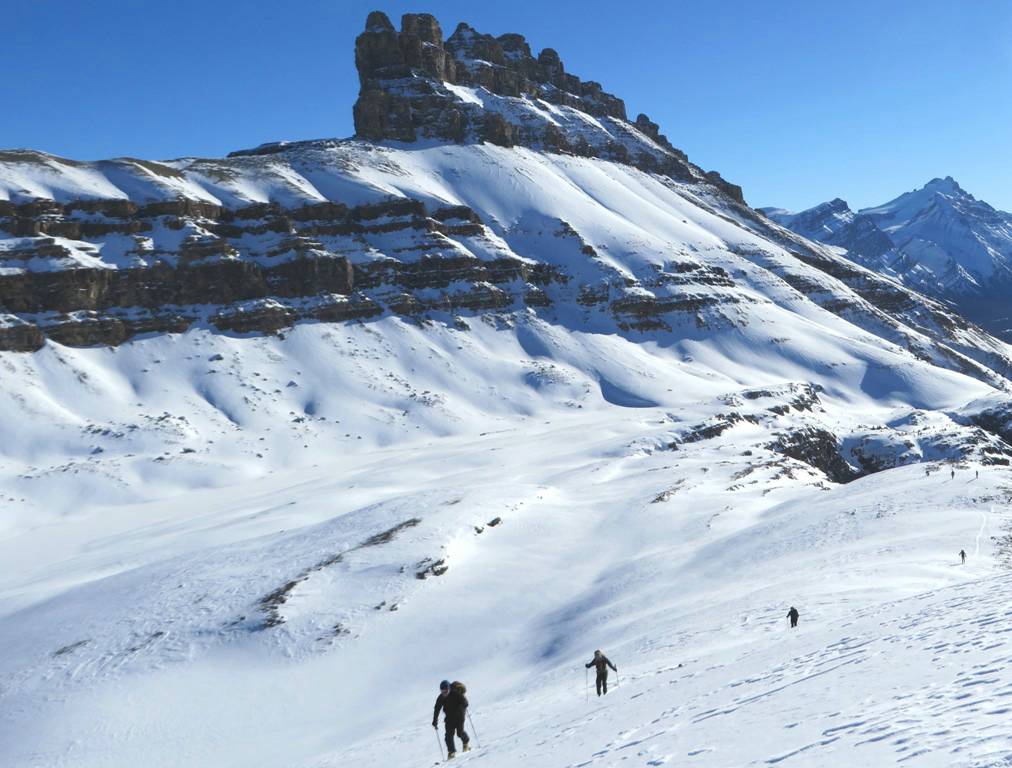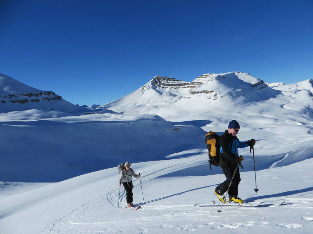 The exit through the trees to the highway was reasonable , except for a 100 metre section on the upper part, which was like glue. One of the trip members did suffer a muscle pull in his leg on this section. Everyone was back down to the road by 3:45 PM. The trip was completed in 6 hours. Total distance 19 km, and total elevation gain 650 metres. Thanks to Arnold, Ed, Jeannine, Doug, Bill, Manfred, Terry and guest Elizabeth Westberg for joining me Kevin (C/S) on this classic ski tour in the Rockies.