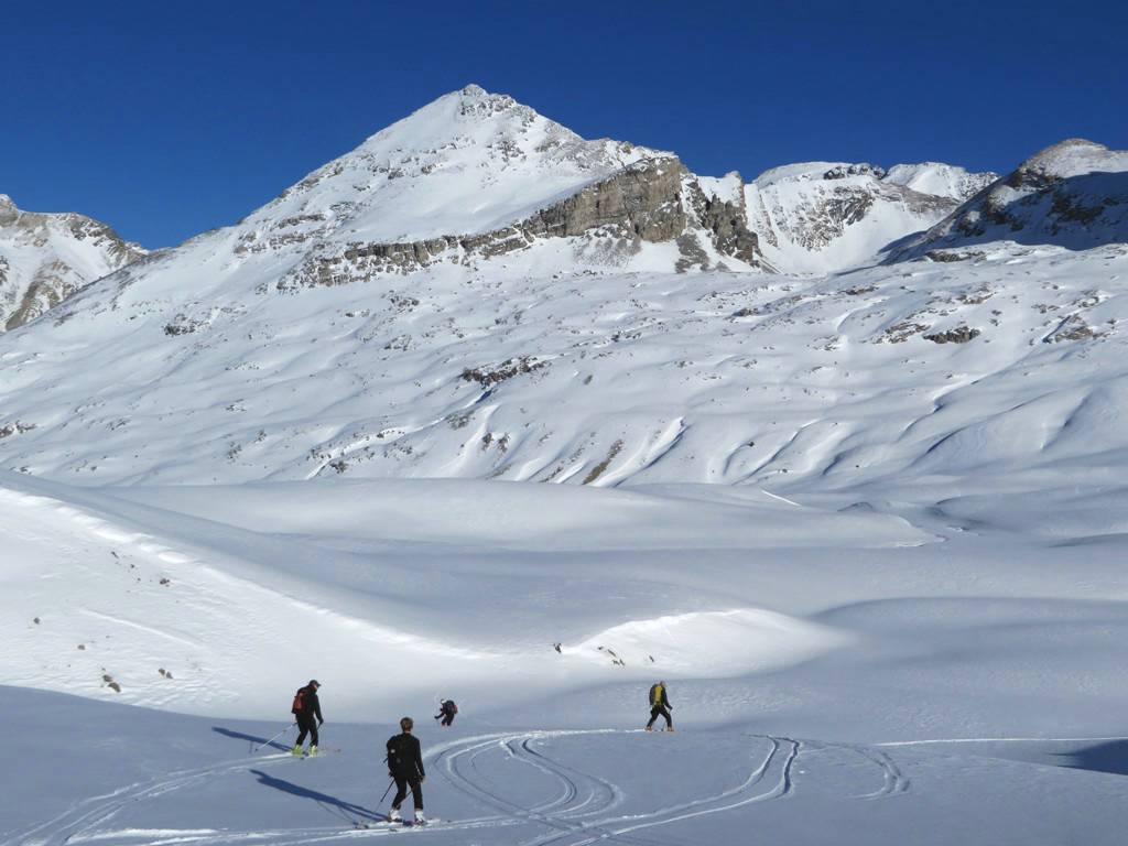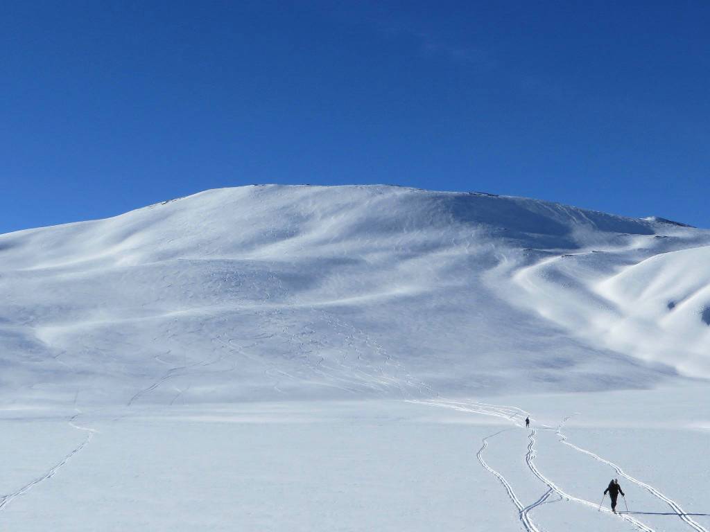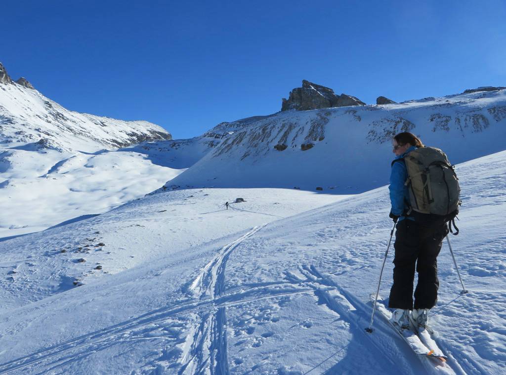 The run down from the col was in the sun on firm packed (not icy)snow - which again allowed for some more turns.