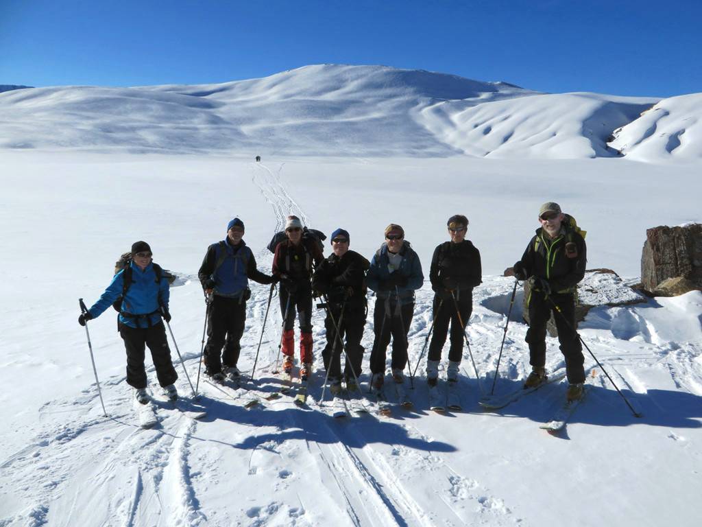 The lack of recent snow in the last few weeks was apparent throughout the trip, with large sections of the upper peak slopes relatively snow free. The ski down to Katherine Lake was on firm but not icy snow - which did allow for linked turns. In the absence of fresh powder, the group proceeded on to the boulder above Katherine Lake for a sunny lunch and scenery break.